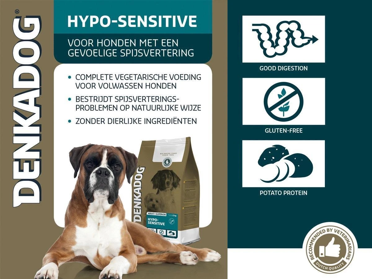Speciaal ontwikkeld voor de Denkadog met een gevoelige spijsvertering. Klachten die vaak voorkomen bij Boxers, Buldoggen en Herders. Zaken als een rommelende maag, buikgeluiden, diarree, braken en winderigheid worden tot een minimum beperkt. Zonder dierlijke eiwitten, lost veel problemen op.